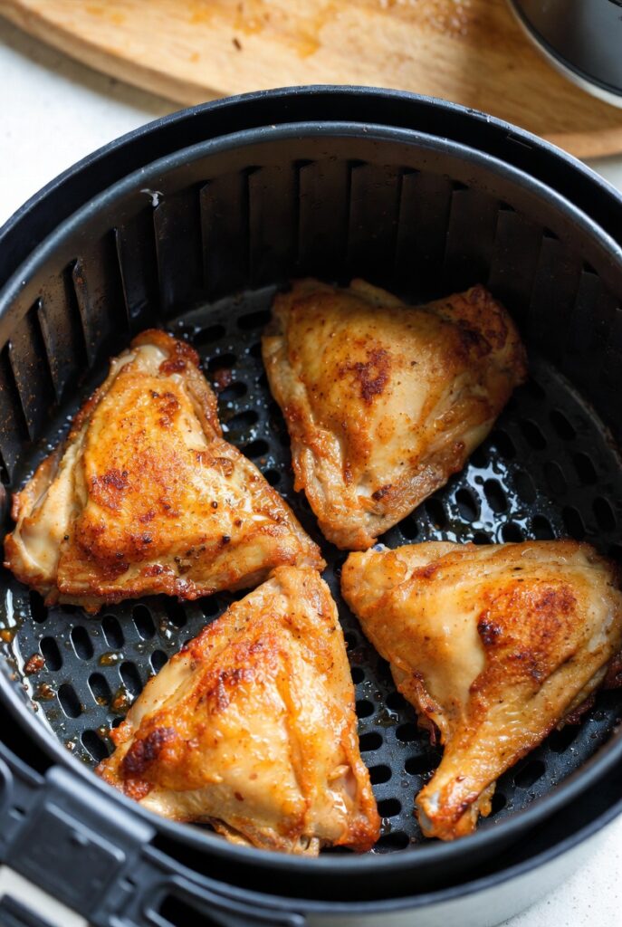 Place chicken pieces in the air fryer basket in a single layer. Lightly spray or mist with oil. Cook for 20–25 minutes, flipping halfway through, until the chicken is golden brown and crispy.