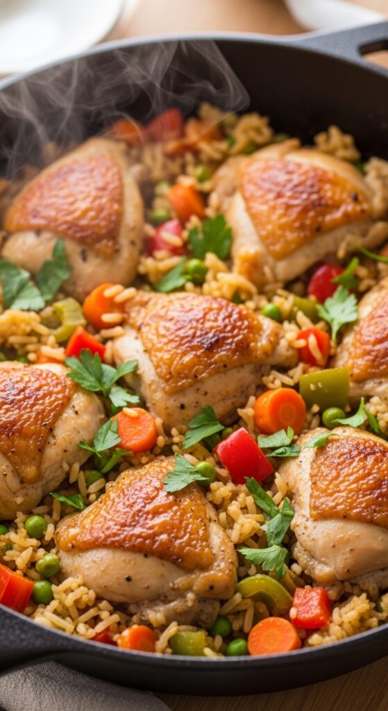 What makes this recipe special is its ability to cook everything in one pan, letting the rice absorb the chicken juices while maintaining moist, tender chicken and perfectly cooked rice. It’s ideal for lunch, dinner, or meal prep, and can be paired with fresh vegetables or salad for a complete meal.