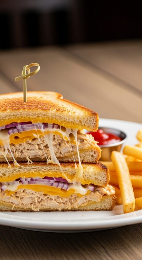 This sandwich stands out because of its perfect balance of textures—crispy golden bread on the outside, tender chicken in the middle, and stretchy melted cheese that ties everything together. Whether served for lunch, dinner, or a quick snack, the Chicken Melt is both easy to prepare and deeply satisfying.
