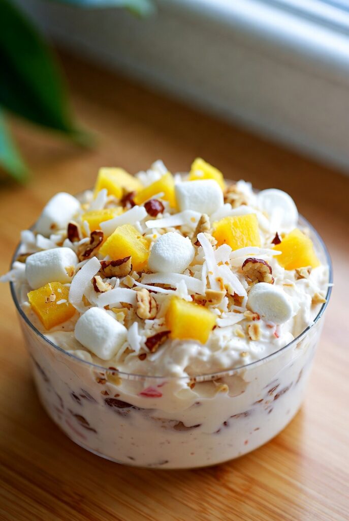 Even without baking, this salad benefits from a “Cold-Crystallization Period.” Once assembled, refrigerate the base (without the coconut and nuts) for 60 minutes. This allows the milk fats in the cream cheese and whipping cream to undergo a minor phase transition, hardening slightly and giving the salad that “Classic-Cheesecake-Mouthfeel.”