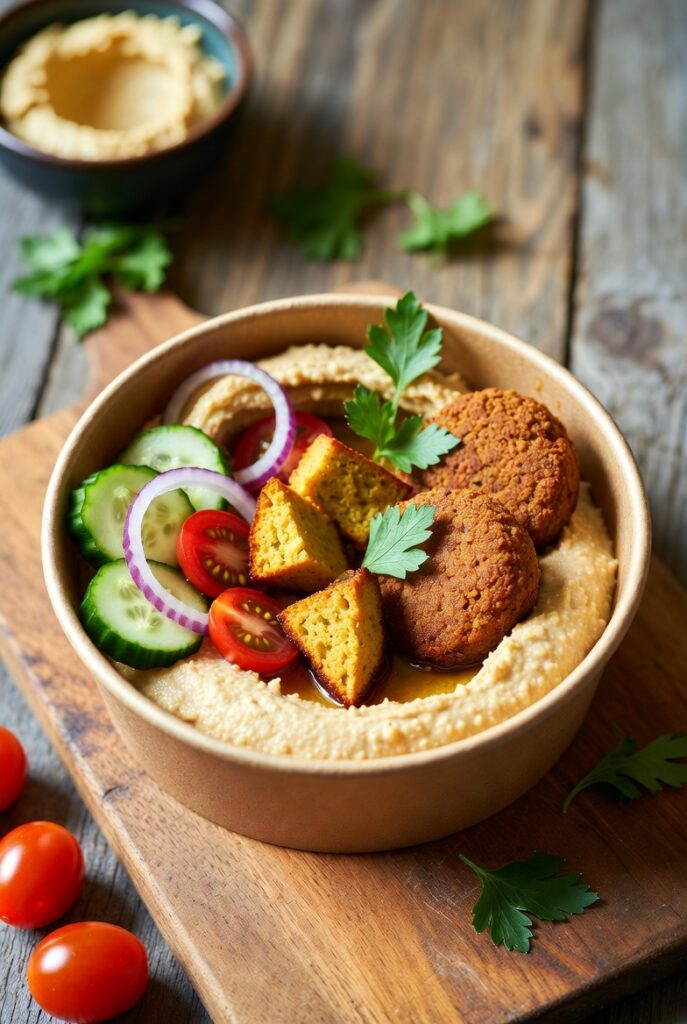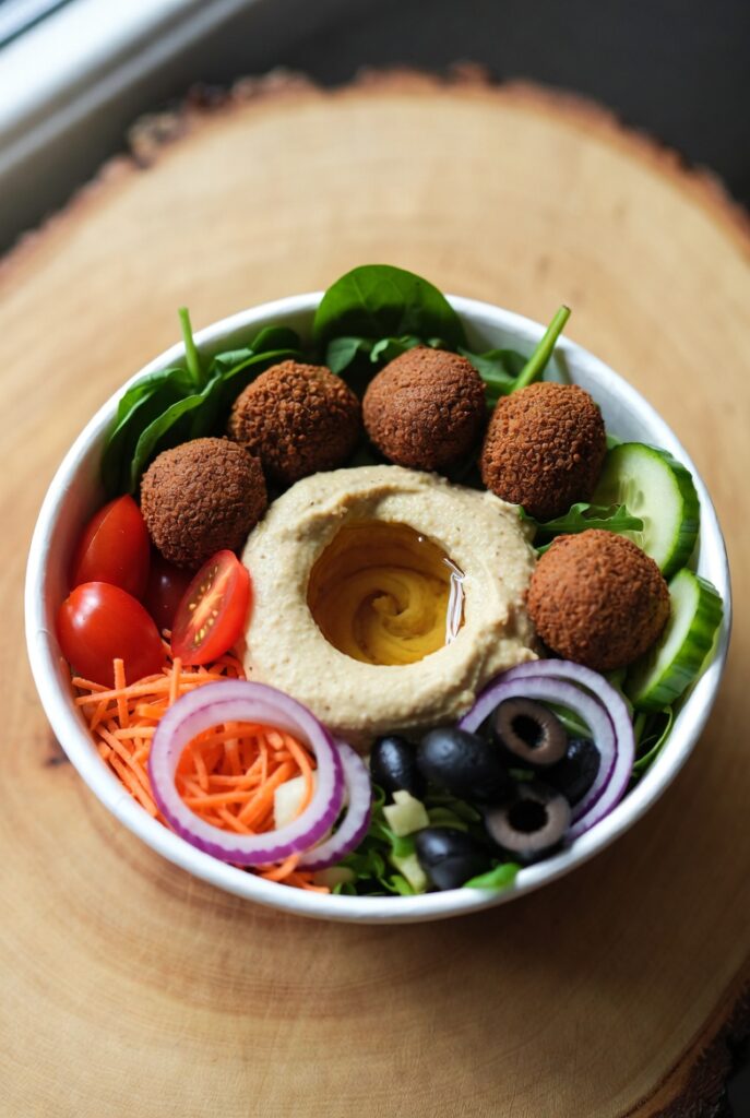 This dish is far more than a simple salad; it is a masterclass in culinary balance. The Mediterranean Buddha Bowl with Hummus and Falafel focuses on the “three pillars” of satiety: the crunch of fresh vegetables, the creaminess of a legume-based spread, and the savory, protein-dense “snap” of a perfectly fried or baked falafel. For the modern home cook, this bowl represents the ultimate meal-prep solution—providing a nutrient-dense, colorful feast that stays fresh in the refrigerator for days and fuels the body with clean, anti-inflammatory ingredients.