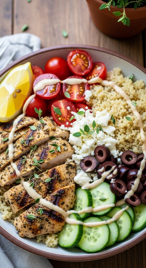 From juicy, marinated chicken to vibrant vegetables, fluffy grains, and zesty dressing, each bite delivers a taste of the Mediterranean. With simple ingredients and minimal effort, you can enjoy a fresh, satisfying meal that’s both healthy and delicious. 🥗🍋🍗