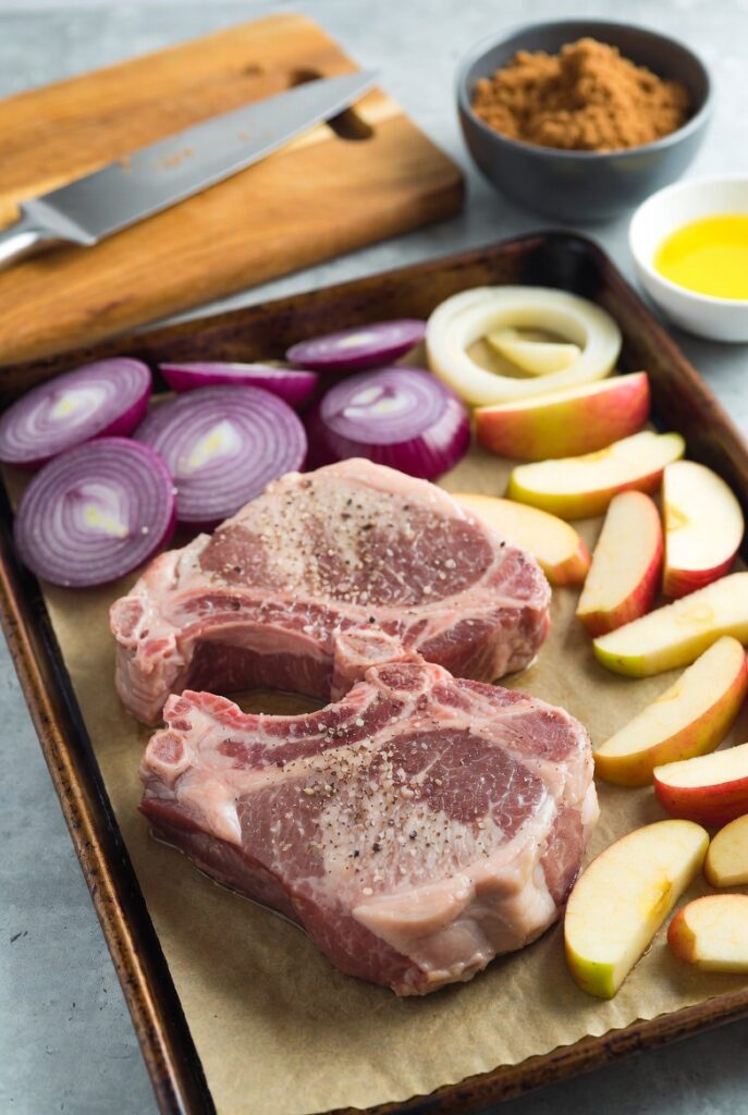Spread the apple and onion mixture onto the sheet pan, leaving four spaces for the meat. Nestling the pork chops directly onto the pan surface ensures a “Bottom-Sear.”