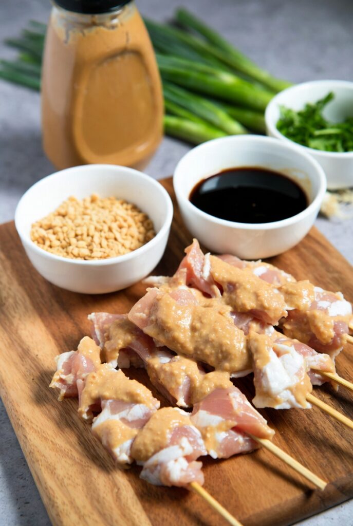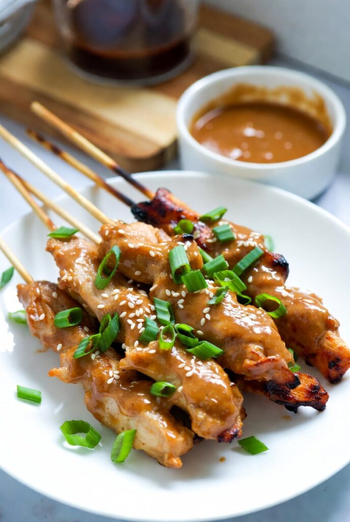 Arrange the skewers on a platter. Drizzle a “Starter-Layer” of sauce over the top. Garnish with crushed roasted peanuts (for “Textural Echo”), fresh cilantro, and sliced Thai chilies.