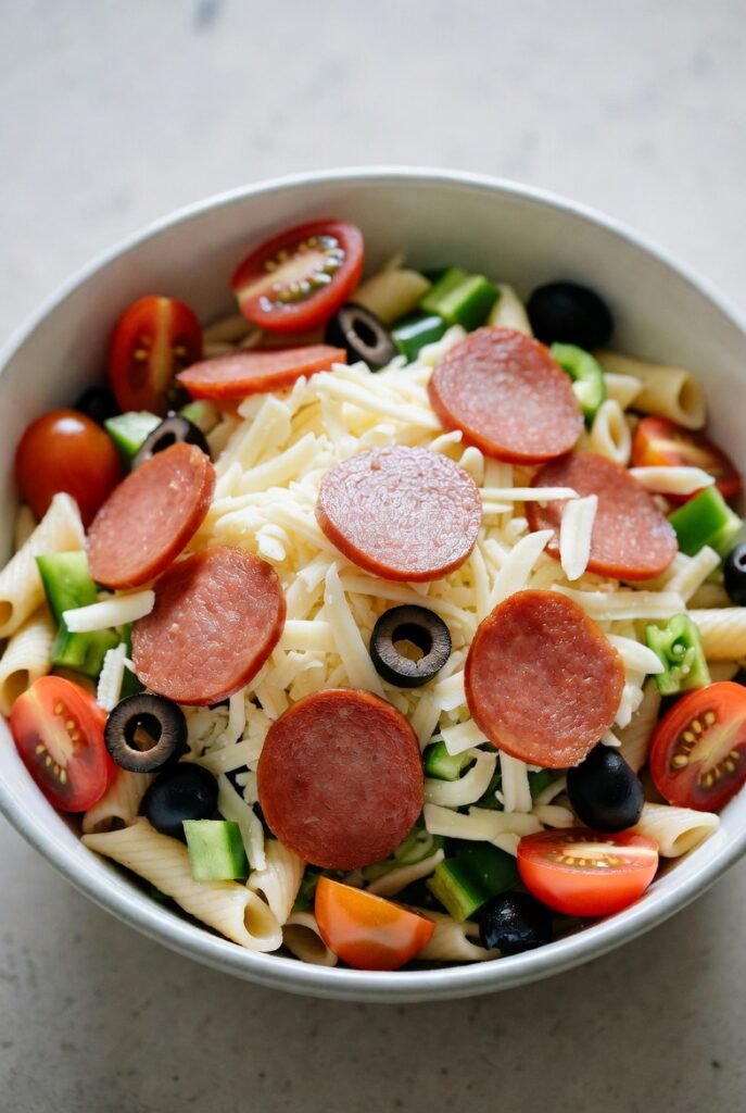 - The “Double Dress” Method: For the absolute Best Pizza Pasta Salad, apply half the dressing while the pasta is slightly warm so it absorbs the flavor, and the other half right before serving for a glossy finish. This technique ensures your Best Pizza Pasta Salad never tastes dry.